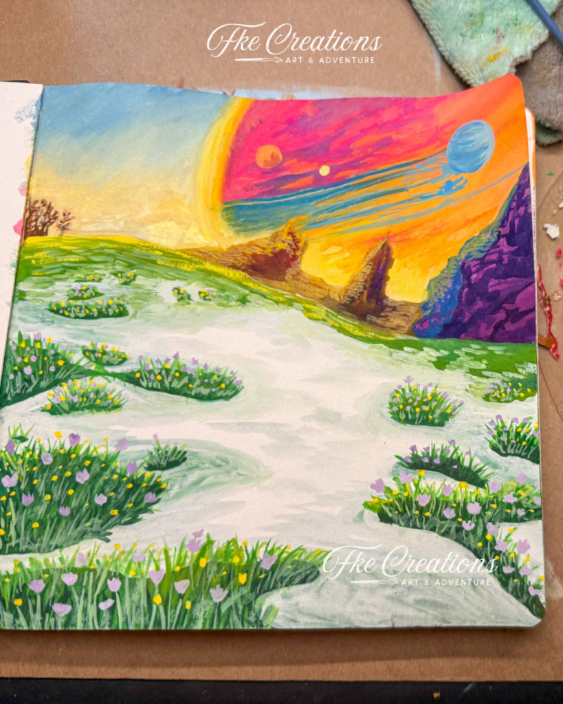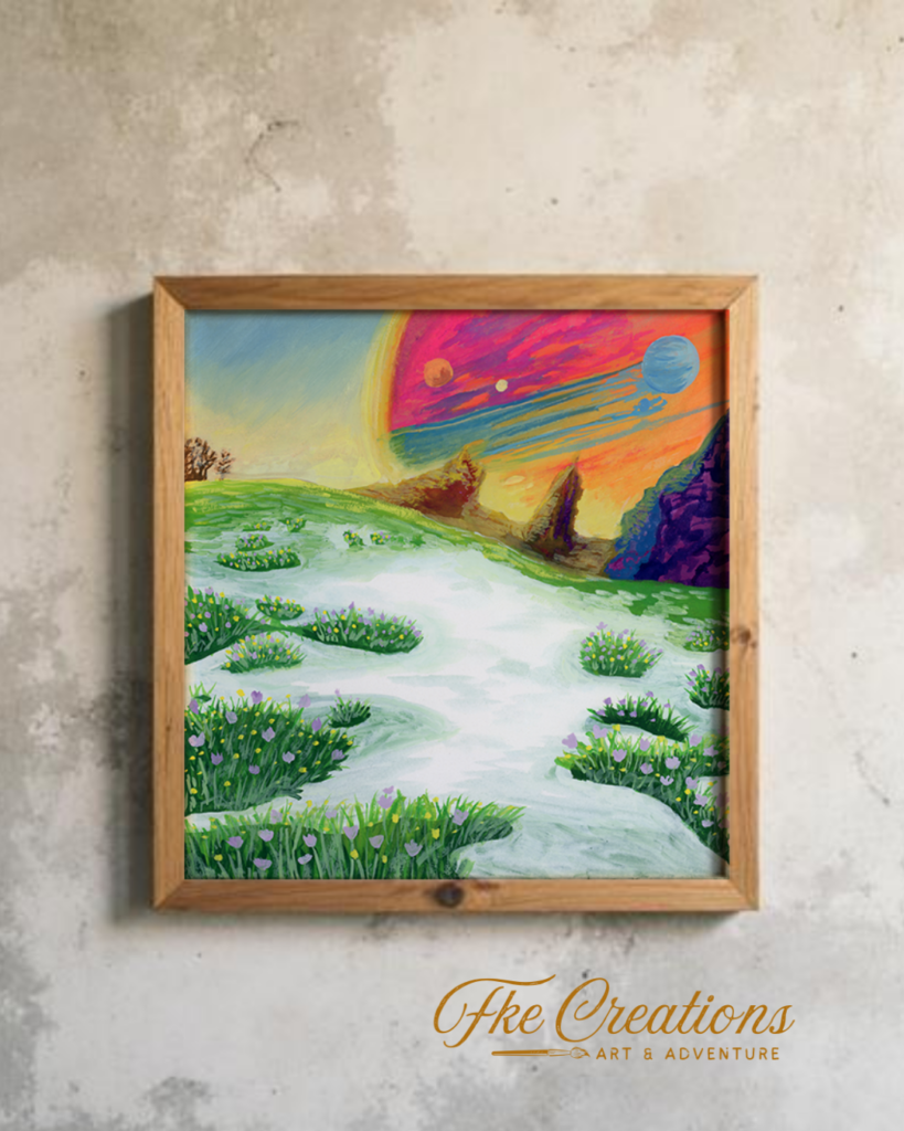 Based on my love of astronomy and sci-fi books, as well as my love for spring and its beautiful flowers. This painting called “Drifting Seasons,” is meant to signify the change of seasons in ones life and how no matter how good or bad your life is going it never stays that way. It is also a little peek at a potential story on a planet known for its golden light and cozy atmosphere, Aurelo.
