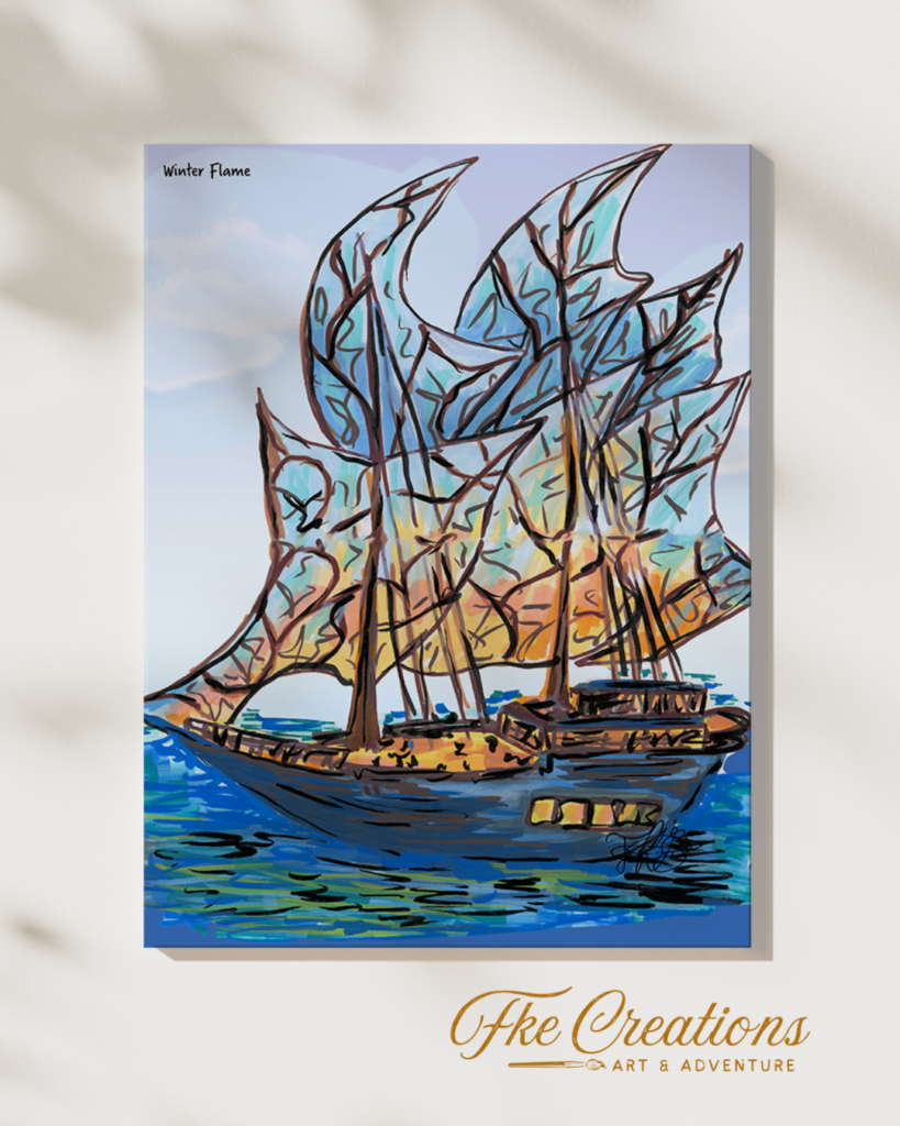 Based on my love of old wooden ships and a few stories I’ve read, my painting ” Winters Flame,” is based on little story blurbs I’ve been working on. The story centers around a girl named Atlee who can see into a magical realm and a species of fairy known as Flairys ( Wing less fairies who can still fly and have mystical powers).